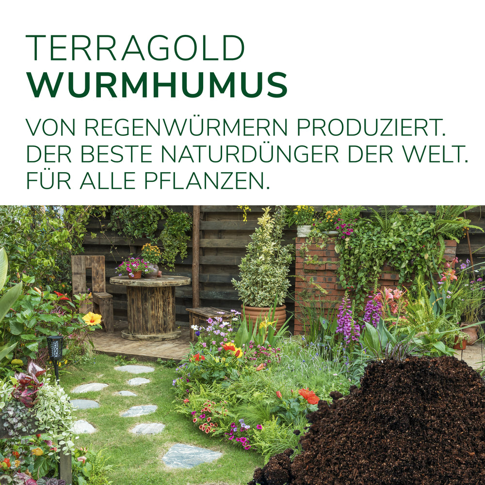 Unser Wurmhumus TerraGold wird zu 100 % auf natürliche Weise von speziell gezüchteten Kompostwürmern produziert. Ohne chemische Zusätze und vollkommen nachhaltig unterstützt er die Bodenstruktur, fördert die Wurzelbildung und stärkt die Abwehrkräfte deiner Pflanzen gegen Schädlinge und Krankheiten.
